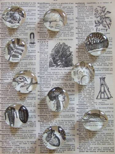But really, you want to donate through The Contemplative Mammoth’s Page, and here’s why: Every $5 gets you a drawing for a set of ten custom science-themed marble magnets, handmade using vintage paper by yours truly. They can be a random assortment (like those pictured to the left), or on a sciency theme of your choosing (e.g. climate, microbiology, botany, sharks, earth science…).