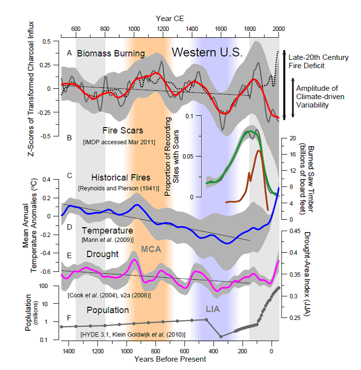 Such low burning is not normal for the Western U.S., however. Despite a gradual decline in fire over the past 2000 years, burning was never as low as it was during the LIA or in the 20th century. Large fluctuations, lasting centuries at a time, however, were common, and largely track increases and decreases in temperature and drought. Fire was high, for example, during the warm, dry interval known as the Medieval Climate Anomaly, and again from 1800-1900 AD, thanks to both drought and the fire-happy early settlers of the West who intentionally and accidentally caused many fires through logging, camping, and railroading.