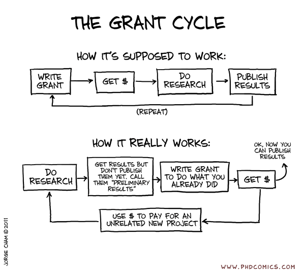 From PhDComics. The joke I’ve heard is that research grants fund you to do the work you’ve already done.